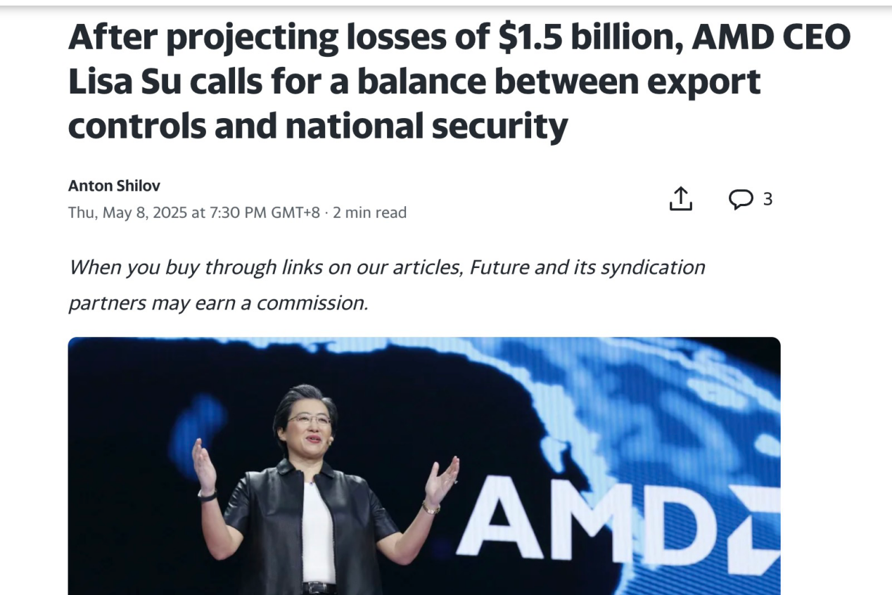 【环球网科技综合报道】就在AMD因美国出口管制而计入8亿美元库存费用,并预计2025年总损失达15亿美元后的第二天,该公司首席执行官苏姿丰表示,必须在出口管制与技术应用方面取得平衡。她表示,中国是全球最大的市场,为美国企业带来巨大的机遇。